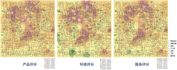 产品、环境、服务大众点评评分插值分析(颜色越暖数值越高,数值由深绿、绿、黄、橙、红、粉、白色依次增大,下同)