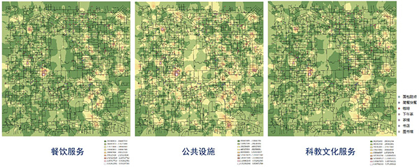 工作学习类第三空间较多处于居住区餐饮服务、公共设施、科教文化服务的评价低洼处,一方面说明其对周边这三类服务的水平要求并不高,对区位依赖小;另一方面也可以将其看作是城市公共服务的重要补充。
