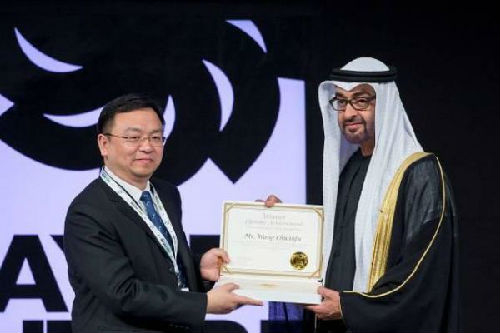 资料图片:2014年1月21日,比亚迪董事长兼总裁王传福获得扎耶德未来能源奖。该奖是作为表彰在新能源与可持续发展领域创新成果的世界级奖项。 (新华社)