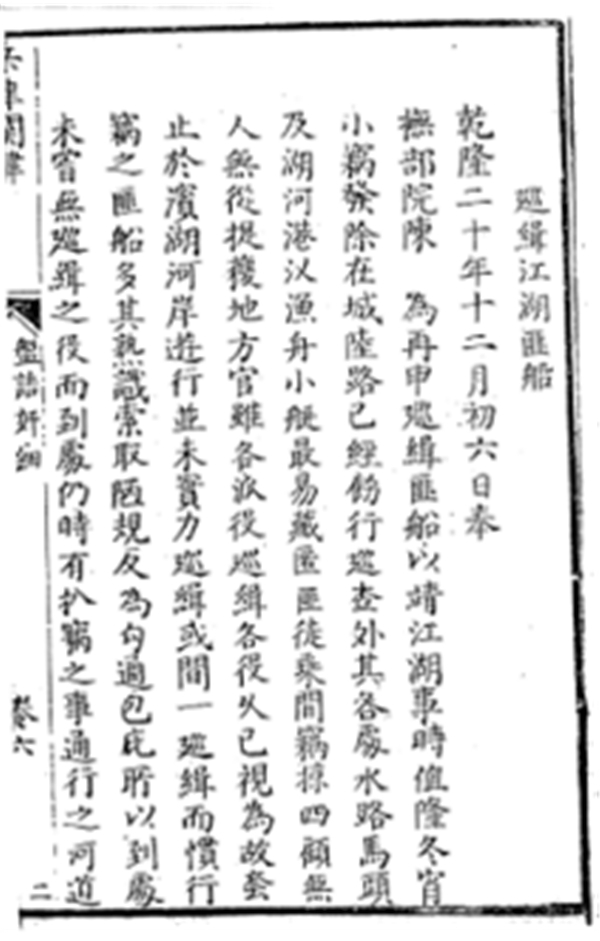 第一类是民间文献,包括契约、族谱、碑刻、水路歌等。船户的运输契据存世数量较少,由于船契一般在预定航运结束后就没有实际效用,所以保存下来的不多,当前发现的船契都留存于系列文献中,较为分散。如山西大学历史文化学院杨建庭老师发现的“官牙云祥老行”船契,便是深藏于山西商人的系列文书群之中。船户家族的族谱也很罕见。传统观点认为,船户作为流动的人群,且文化水平不高,应该较难形成家族并撰修族谱。然而在犹他家谱学会网站排查湖南族谱的过程中,陈瑶发现了湖南湘乡县涟水沿岸的《白沙陈氏必元房谱》,结合《湖南省例成案》中提到的湘乡县邓、潘、陈三姓船埠,进一步搜集到《江口邓氏族谱》《涟西潘氏广系二修支谱》等相关船户家族族谱。此后,在湘乡涟水沿岸的白沙村发现陈氏船户家族在乾隆五十一年(1786年)所立碑刻《永定章程》,该碑是目前发现的较早的与内河航运有关的碑刻实物。另外,湖南调查局编印的《湖南商事习惯报告书》中也收入了部分船户的碑刻,如《岣嵝门船帮条规(邵阳)》《毛板帮条规(邵阳)》等。水路歌是内河船工的行船歌谣和劳动号子,是一种口传文献。目前已出版的《中国民间歌谣集成》及各省市县资料册,收录了不少水路歌的文字版本,其内容多为船户驾船的行船技巧与口诀,而据陈瑶对老船工的口述访谈发现,水路歌也是船工葬礼的仪式曲目,这一点在注重“全面性、科学性、代表性”的民间文学三大集成的文字资料中被隐藏了起来。