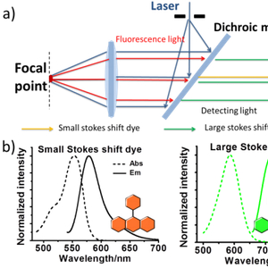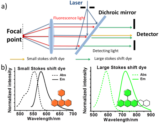 荧光成像作为一种直观、原位的可视化观测技术在功能分子标记和检测方面得到了广泛的应用。其中,以有机荧光染料为基础的生物分子标记和分子荧光探针具有操作简便、重现性好等优点,可方便用于实现生物分子的原位、实时无损伤检测以及生物分子及其生物过程的追踪。然而,大多数荧光染料(如荧光素,罗丹明,恶嗪和花菁素)的Stokes位移都非常小(一般小于30nm),导致激发光谱和发射光谱之间的严重串扰,造成成像时信噪比低和严重的荧光自猝灭现象(见图),限制了其在生物成像中的应用。