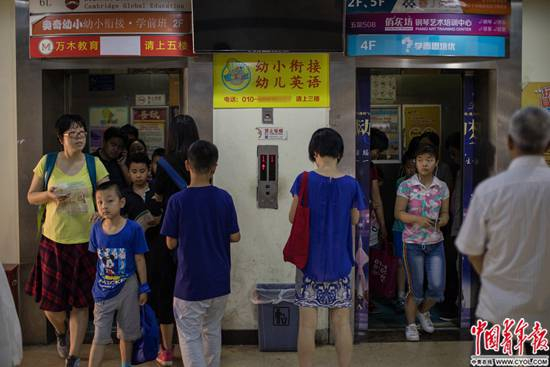 周末,孩子们背着印有培训机构Logo的背包,里面放着白色的跆拳道服或粉紫色的舞蹈裙;或者一手拎着装有奥数卷子、英文教材的布袋,一手被步履匆匆的爸妈拉着,从已经停满汽车看似无处下脚的路口现身,涌入绮美大厦的两台电梯,2到6层的电梯按钮被全部按亮。