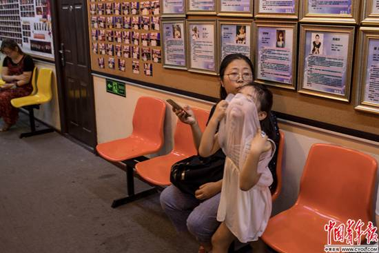 大厦五楼离厕所不远的20平方米小屋里,摆了两排医院里常见的镀铬椅子,上面坐满了等待的家长。他们大多低头看手机,很少交谈。相邻的钢琴培训班走廊墙上,屏幕上滚动播放小学员的比赛视频和名师介绍。在同一层的一家舞蹈学校前台,有家长已经掏出手机,扫二维码续交了下一季度的学费。