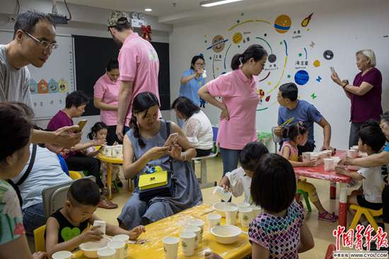 5月26日,周六,北京市海淀区绮美大厦,一家幼小衔接教育机构的活动室内,孩子和家长在老师的指导下制作蛋糕杯。据介绍,这座大厦里扎堆儿着30余家教育培训机构,每周有五六千名孩子来上课。
