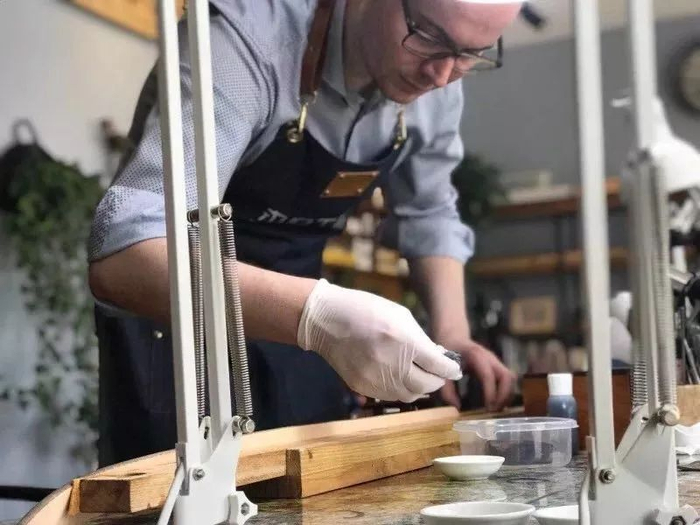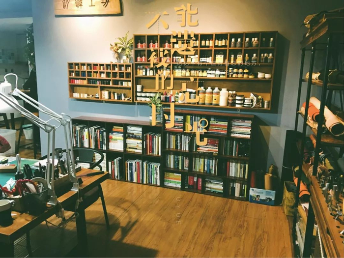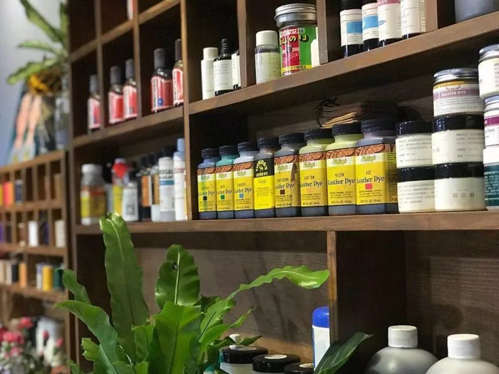 工具、染料、处理剂齐全:满墙的瓶瓶罐罐,光是看看就充满喜悦啊。在这里自拍凹造型,分分钟成匠人啊。