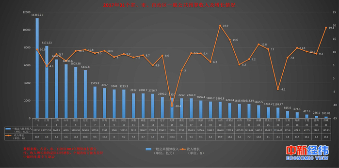 2017年,天津、吉林两地的一般公共预算收入出现了负增长。天津2017年一般公共收入2310亿元,完成预算81.4%,考虑全面推开营改增试点减收翘尾因素,按可比口径比上年下降10.4%。天津市财政局认为,收入下降的主要原因是,在经济发展由速度规模型向质量效益型转变时期,坚决落实国家减税降费政策,严格规范非税收入管理,积极调整财政结构,降低非税收入占比,努力做实做优财政收入。