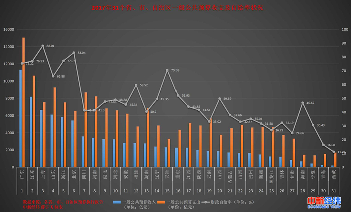 中新经纬客户端5月31日电(薛宇飞) 财政收入,是一个行政区域硬实力的体现,决定着这个区域在城市建设、民生支出等方面的投入,而一般公共预算收入则是财政收入重要的组成部分。根据各地2017年预算执行报告统计,广东、江苏、上海三地的一般公共预算收入位居前三甲,广东省更是高达1.31多万亿元;增速上,山西、西藏、内蒙古增长较快,吉林、天津出现负增长;财政自给率方面,东高西低的态势十分明显。