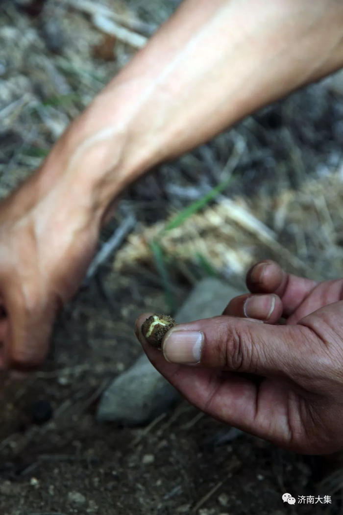 “这里海拔452米高,土壤PH值4.6,微酸,有机质十分丰富……”赵总还饶有兴致地带记者参观了临近山顶的“林下野茶”基地。仔细观察,一颗颗粗壮的松树下是一棵棵茶树。赵总不无自豪地说,这是他花了十四年时间研究的“林下野茶”项目。经过多年的研究,自己渐渐摸索出适宜野山茶种植的种子、种植的土壤、种植的时间以及种植方法。自己给它起了一个名字:鲁甲1号。如今,最早种下的那一批已经逐渐进入收获季节。不过,更多的还处在萌芽阶段,随手扒开脚下一堆黑土,几粒黑黝黝的“粪球”映入眼帘,这就是茶种!