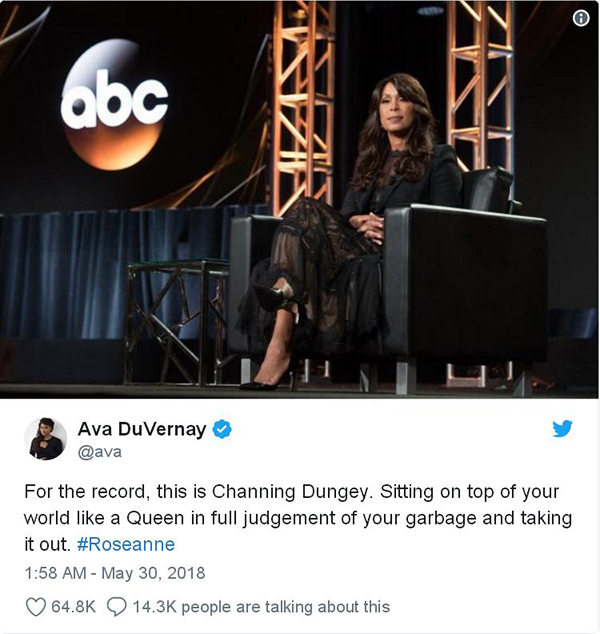 只是,简单的道歉显然已于事无补。几小时后,ABC电视台发表公告,宣布取消《罗斯安家庭生活》下一季的拍摄计划,而负责传达这则消息的“ABC娱乐集团”现任主席钱宁·邓吉(Channing Dungey),恰恰也是一位黑人女性,而且还是美国各大电视台有史以来首位非洲裔掌门人。很快,维亚康姆集团(Viacvom)宣布旗下频道不会再重播任何一集《罗斯安家庭生活》,在线视频网站Hulu也已抽起站上所有《罗斯安家庭生活》剧集。甚至是巴尔所在的经纪人事务所,也已宣布与其结束代理合同,斥责其此番言论“有违公司核心价值”。
