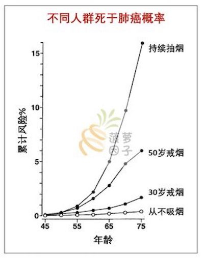 •不吸烟的人,75岁死于肺癌概率只有0.3%,而一直吸烟的人平均概率是16%,超过50倍。