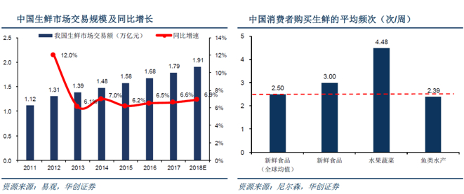 生鲜是日常生活不可或缺的必需品,在零售消费市场中占据重要地位。根据尼尔森对亚太零售的研究,亚洲消费者食品账单的50%以上花费在生鲜上。我国由于庞大的人口基数,生鲜消费市场空间广阔。根据易观数据显示,2017年我国生鲜市场交易规模达1.79万亿,同比增长6.9%,且自2013年以来持续保持6%以上的增长,预计2018年生鲜市场交易规模将继续增长至1.91万亿。