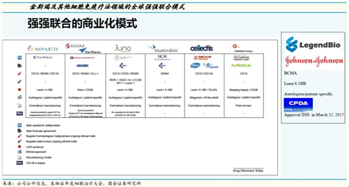 国金证券指出,CAR-T的历史舞台已经从三个初创(巨诺、凯特、诺华的一个CAR-T管线),演变成三巨头(新基-巨诺、吉列德-凯特、诺华-更多管线与新联合产业链上游企业)的舞台;当快速推进的生物医药前沿技术被验证有效、并获得合法转化应用的路径,所有的巨头都不会缺席;免疫细胞疗法正是其中之一,而其中的冰山一角——针对血液肿瘤的CAR-T将会是最快获得推进的相对成熟疗法。免疫细胞疗法相关企业的海内外联合,将会更多更快地出现。