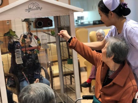钱璐带着老人给机构饲养的虎皮鹦鹉喂食,这也是动物疗法之一种。
