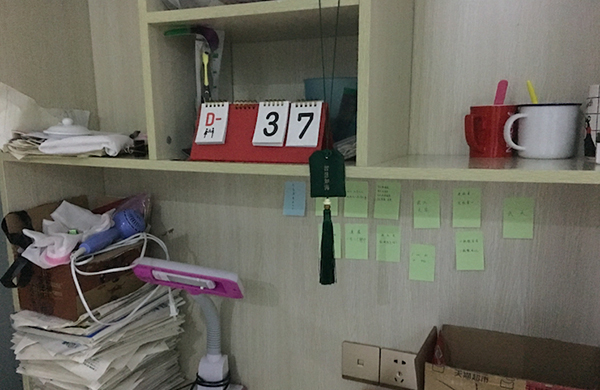复读班的教室里,木色的桌椅整齐地连排摆放,桌上堆着高高低低的教材和各式各样的水杯。到了高三,教室的墙上会陆续贴上一些励志标语,有的是诗词、有的是带哲理的“鸡汤”。