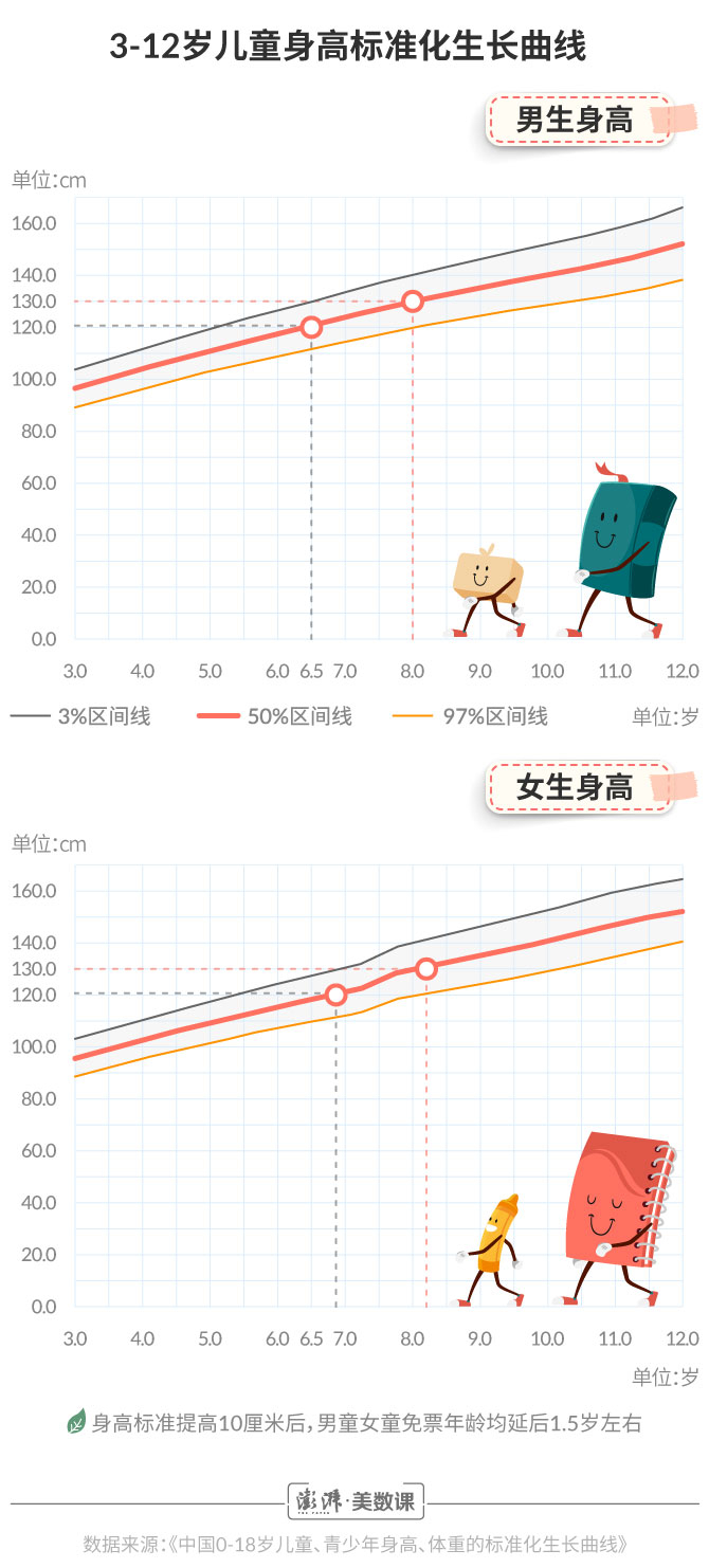 参考儿童身高的增长趋势将标准线提高至130厘米,相较120厘米而言,是一个更为合理的选择。参照首都儿科研究所生长发育研究室和北京大学儿童青少年卫生研究所共同发布的《中国0-18岁儿童、青少年身高、体重的标准化生长曲线》,截取其中3-12岁儿童的身高数据,可以发现:身高线被拉高10厘米后,享受免票优惠的儿童年龄范围大约被拓宽了1.5岁。