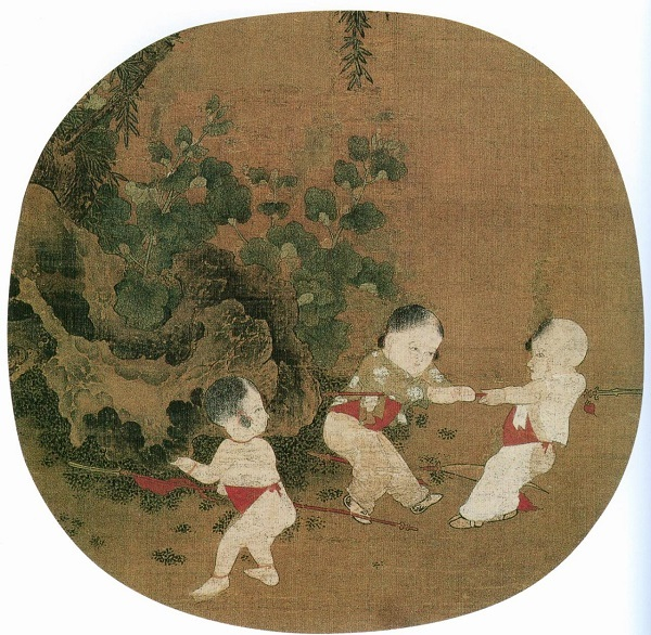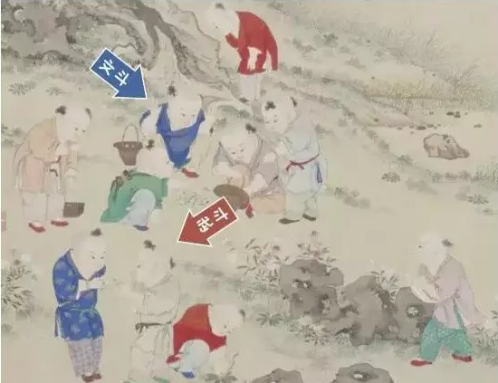 《婴戏图》中有一类场景,最为体现孩子们的活泼可爱,即文斗与武斗。文斗是大家一起做游戏,武斗则是游戏过程中发生的争执,为了某些玩具而大打出手。这类看似普通的举动,却被古代画家详实细致地记录了下来。
