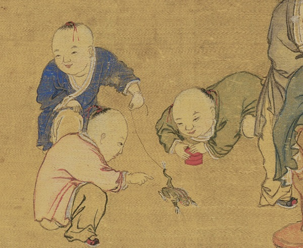 除了婴戏里面“戏”,婴戏图里面还有表现孩童们挑逗小动物的场景。苏汉臣的《冬庭婴戏》中,两位小朋友在挥舞旗帜,用孔雀羽毛来吸引小猫的注意力。天津博物馆所藏苏汉臣的《婴戏图》中描绘的是一个孩子在捉蝶,而在冷枚的《百子图》则有小孩子们逗鸟、逗蛤蟆,在南宋苏焯的《端阳婴戏图》,甚至描绘了孩子们提着癞蛤蟆吓唬别人的场景。