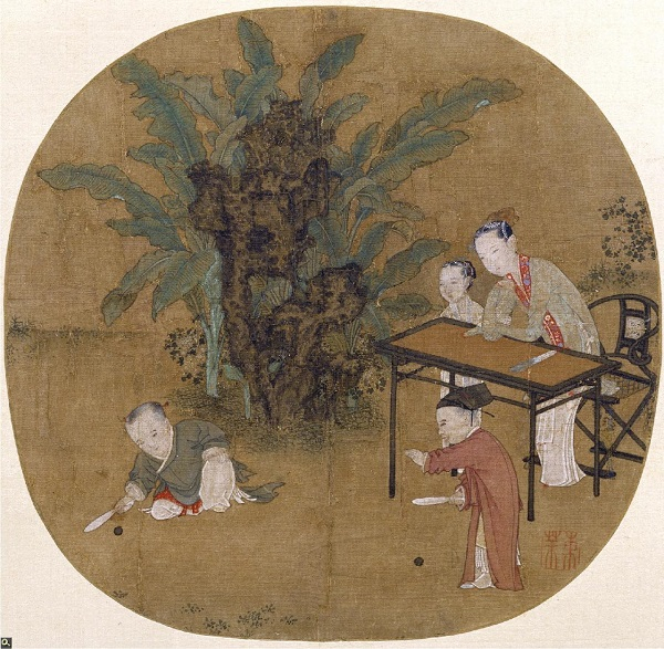 苏汉臣的《秋庭戏婴图》与美国波士顿美术馆藏苏汉臣的《婴戏图》都描绘了孩子们在庭院中玩一种叫做“推枣磨”的玩具,而这种玩具直到现在还存在。如山东省的地方上流传着“黑狗追黄狗,捉住咬一口”的俗语,就是用以形容这种玩具。殊不知,支架上的二者永远追不到彼此。这恰恰让孩子们兴奋一整天!竹林中读画(苏汉臣《长春百子图》),芭蕉下打球(苏汉臣《蕉阴击球图》),老树下斗草(金廷标 《群婴斗草图》)等等也都是孩子们文斗的体现。