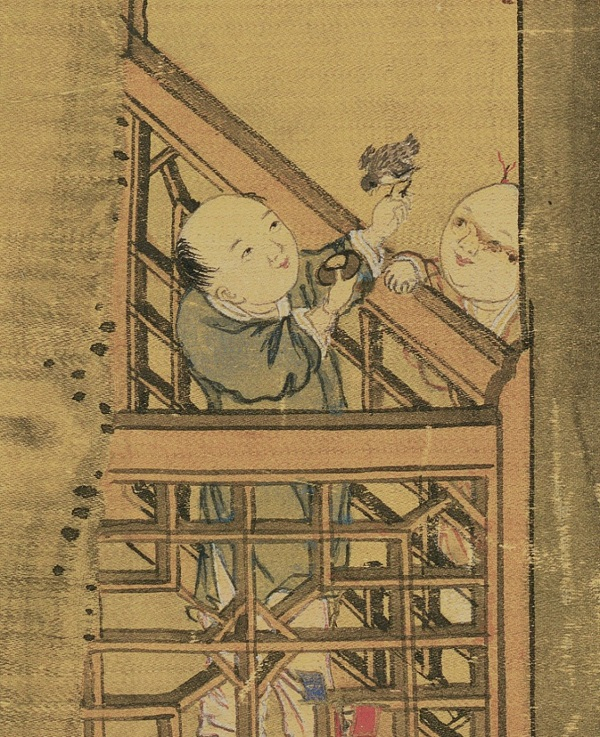 然而正是因为孩子们对这些玩具的迷恋,才引来了“大打出手”的武斗。有的为了一件兵器玩具而各不相让,如宋陈宗训的《秋庭婴戏图》;有的为了桌上的玩具厮打混战,如宋佚名的《小庭婴戏图》、 明人仿周文矩的《婴戏图》;还有的甚至为了一根小草而据理力争,如清代金廷标的《斗草图》。