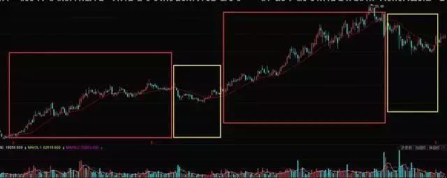 当来到黄色区域的时候,是减仓和观望的时期。注意第一个黄色框,转红的区间,我是等待K线站稳之后,再进行加仓的测试。