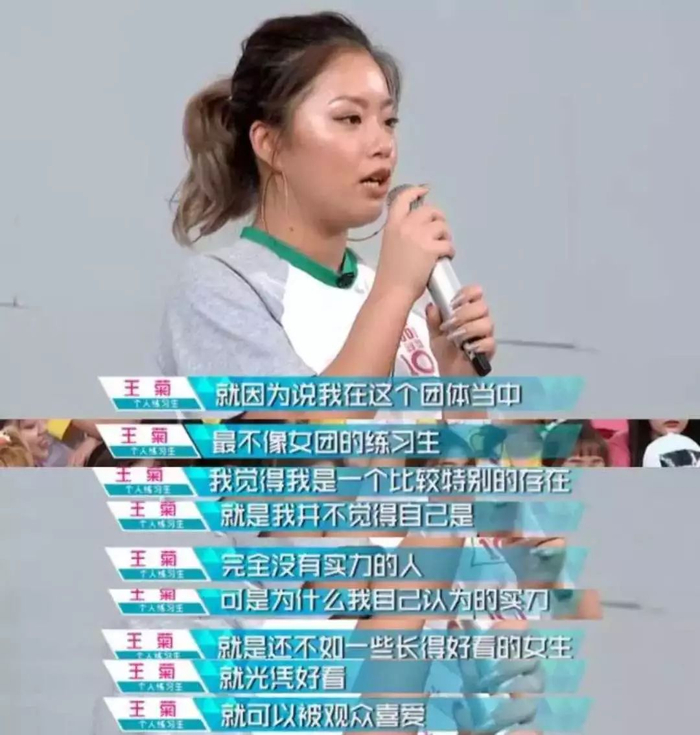 事实上,王菊的形象、台风与大家对传统女团的认识相去甚远。她皮肤黝黑、身形粗壮,站在一群白瘦美之间,注定就是那个分分钟要被秒杀的。所以,王菊也被认为是有史以来最不适合做女团的练习生。