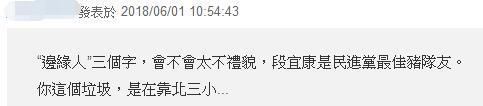 段宜康的这番“边缘人”言论还没等到吕秀莲亲自回应,网友们就看不下去了:“曾经与这种人同党还真倒霉”“有本事不要待在不分区”“人家边缘至少还能当副‘总统’,不像你自己其实边缘到个极致,只能发个废文”“你的曲棍球呢?”“支持段宜康=支持姚文智=支持民进党”“做人总比做畜牲好”“要不要吞曲棍球。”