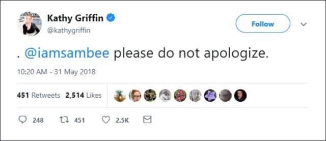 该节目播出后引起了轩然大波,萨曼莎·比随后在社交媒体推特上发文致歉。而特朗普则于6月1日发文质问,“为何她还没有被开除”。