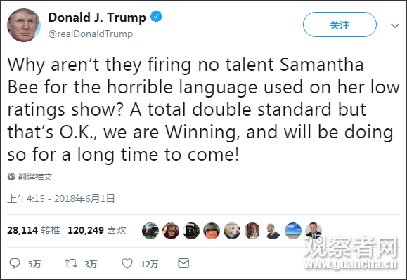 6月1日,特朗普本人也推特上发文质问:“为何不因为萨曼莎·比在收视率很低的节目中,使用的可怕语言而开除她?”