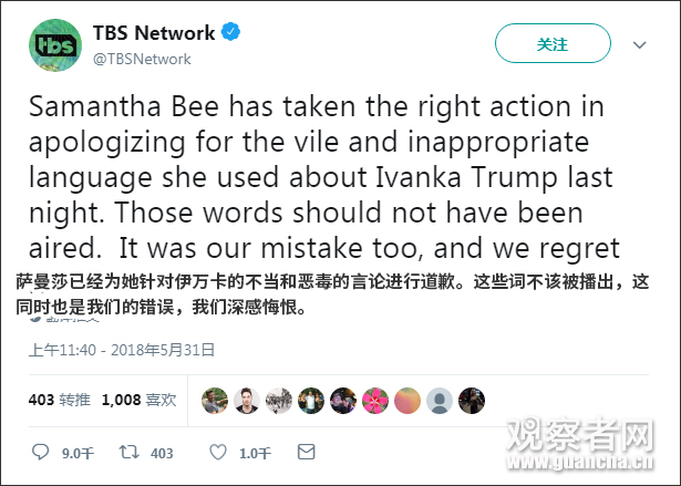 TBS则在官方推特上发文称,支持萨曼莎·比的道歉,并表示“这些话不应被播出,同时也是我们的错误,我们深感悔恨”。