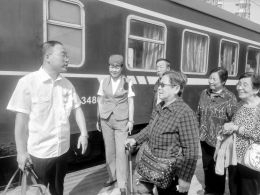 9:12,2672次列车停靠在榆次站。经过简短的交接,车长带领6位老人上了车,宋斌细心地嘱咐他们:“已经和车长交待好了,这一路上,列车上的工作人员会特别留意照顾大家,有什么事尽管说……”