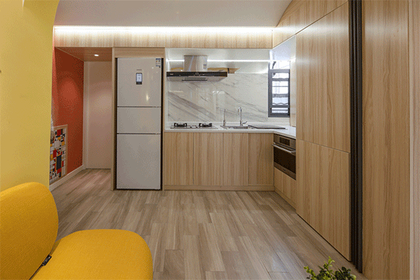 “小户型的设计需要注重人的体验性,对空间要有很好的功能划分,在此基础上,还可以增加空间的可变性,以时间换空间。”张海翱告诉记者。在这个项目中,隐形餐桌的设计让空间的利用变得更加灵活。“不吃饭的时候,把桌子收回去,整个房间变得很通透。”而在改造后的小胡房间,床可以翻折,翻折后露出地台,这里既是供小胡接待朋友的空间,也是一个大容量的储物空间,“小胡喜欢收集鞋子,整个地台可以收纳一百多双鞋子。地面和墙面上也有很多储物柜。”张海翱说道。“很多时候,一个空间可以有多种功能,白天和晚上可以有不同的功能。”