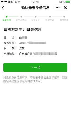 该试点项目实施后,新生儿父母可以登录粤省事微信小程序,通过手机进行身份认证后,申领和预约取证。在纸质出生医学证明签出的同时,同步生成出生医学证明电子证照,新生儿的父母可以在手机微信卡包里查看。该电子证照有可信数字证书,具备全省互认、便于查询、不会丢失、安全可靠等特点。