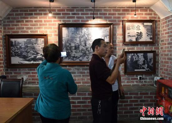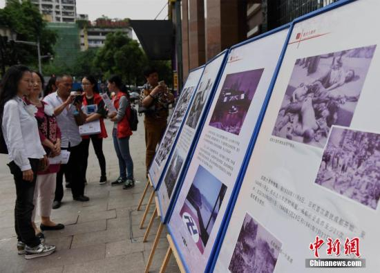 重庆大轰炸幸存者及志愿者在重庆大轰炸“六五大隧道惨案”遗址前参观历史宣传展板。 周毅 摄
