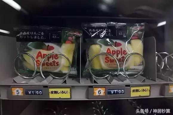 吃水果不一定要到超级市场买,在贩卖机买也很方便。苹果被洗净切好,还有香蕉、橘子等多种水果。