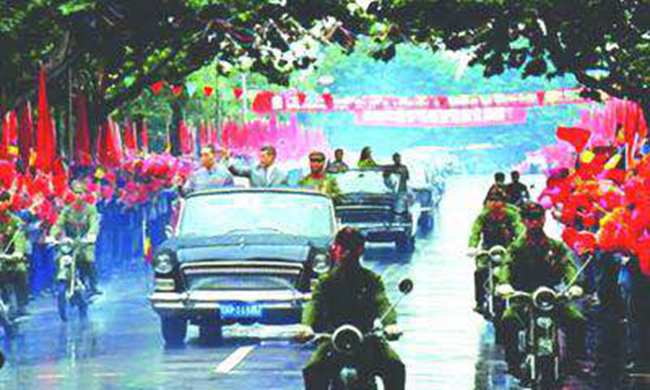 1971年6月6日,在国务院总理周恩来的陪同下,罗马尼亚共产党总书记尼古拉·齐奥塞斯库与夫人率领党政代表团访问南京(如图)。齐氏5日抵达,在南京停留两日,参观了南京长江大桥等地。在大桥上,周恩来向齐氏介绍了中国大桥建造的技术经验。