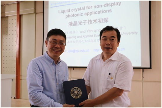 6月4日上午,南京大学陆延青教授应邀做客厦门大学“南强学术讲座”(第882期),在海韵园教学楼504报告厅为师生们带来了一场题为《液晶光子技术初探》的精彩学术讲座。校长助理李伟中为陆延青教授颁发“南强学术讲座”纪念牌。讲座由电子科学与技术学院副院长张保平教授主持,百余名师生到场聆听。