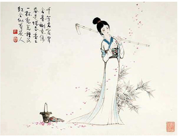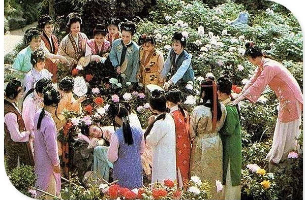 在这表面上花枝招展而显得名不符实的饯花场景中,能够感悟到一股浓浓的悲意,真真正正是以祭饯的视角来看待百花谢位的大观园女儿只有林黛玉一人。所以《红楼梦》这一回的最后,在芒种节这天安排了堪称整部《红楼梦》中最精彩的一个情节“黛玉葬花”。林妹妹“只因昨夜晴雯不开门一事,错疑在宝玉身上。至次日又可巧遇见饯花之期,正是一腔无明正未发泄,又勾起伤春愁思,因把些残花落瓣去掩埋,由不得感花伤己”,泪眼对落花,伤心地吟唱出了千古绝唱《葬花吟》:“尔今死去侬(“侬”作“我”解,与今日吴语用法不同)收葬,未卜侬身何日丧?侬今葬花人笑痴,他年葬侬知是谁?试看春残花渐落,便是红颜老死时。一朝春尽红颜老,花落人亡两不知!”“花落人亡两不知”一句仿佛预见了日后的悲剧命运,正如甲戌本脂批所云“埋香家葬花乃诸艳归源,《葬花吟》又系诸艳一偈也”。