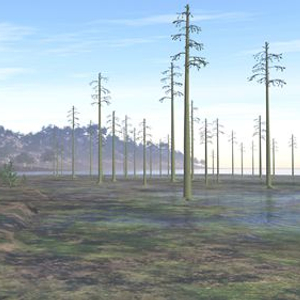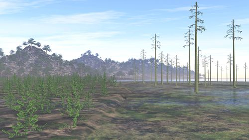 华南板块泥盆纪晚期植被景观的概念性复原图(邓珍珍绘制;右前:乔木状石松类,株高约10米;左前:楔叶类,株高约3米;后方高地:前裸子植物,株高约20米)