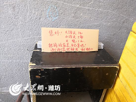 6月6日上午,记者来到高新区北宫东街与东方路交叉口西侧的惠通小区,在门口找到了这个无人看守的馒头摊。有一辆三轮车,上面摆放着馒头、火烧主食的泡沫塑料箱,三轮车上放着一个标价牌,上面写着:“您好!大馒头1元、小馒头5角、火烧1元,请把钱放盒里,自己拿吧,谢谢!”。