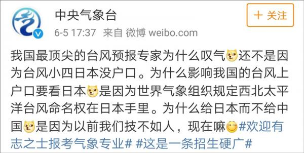 中央气象台官方微博6月5日下午15时写了一篇《台风的自白》,文风“卖萌”: