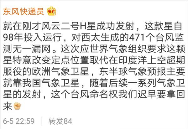 同样是在6月5日,晚上的21时07分,中国最新一颗气象卫星风云二号H星在西昌卫星发射中心由长征三号甲运载火箭发射升空。