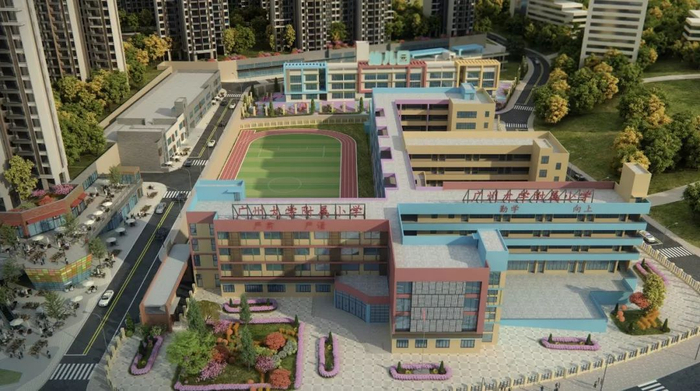 目前,小学已经顺利封顶,在项目南面,还规划有两块教育用地,分别是54个班的9年一贯制中小学和48个班的完全中学。