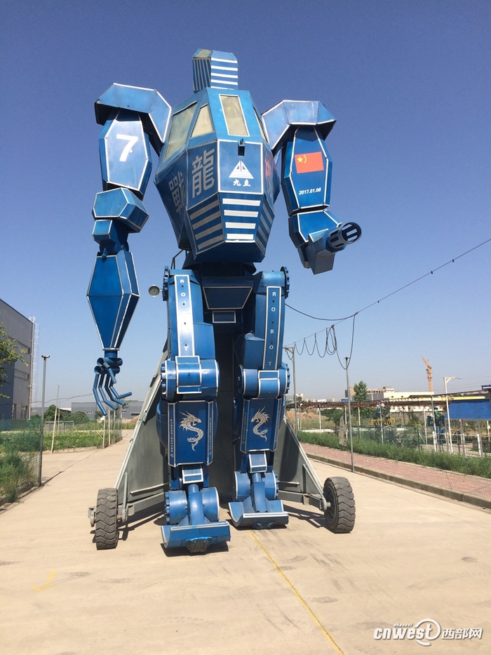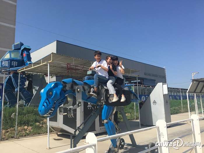 网媒大v们骑上陕西九立机器人制造公司庞大的恐龙机器人。