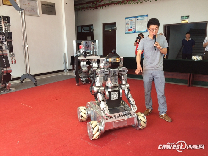 陕西九立机器人科普基地工作人员介绍特种机器人情况。