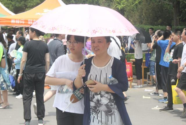 潍坊一中考点外,家长为孩子撑起遮阳伞。