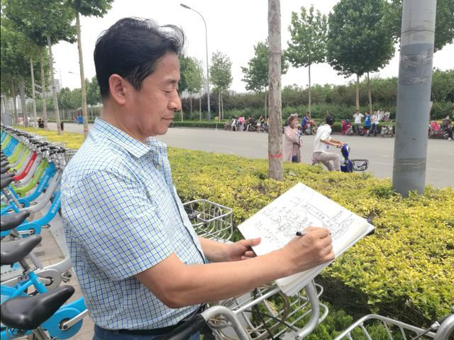 就在这时,记者观察到在学校门口北侧的公共自行车站点位置,有一名家长时而抬头望着路对面的陪考家长们,时而低头写写画画。记者连忙走到这名家长身边看到,原来他在画画,他用公共自行车车把当支架,把画板放在上面,将路对面那些焦急等待着的家长们的动作、神态惟妙惟肖地画在了画板上,让人惊叹不已。