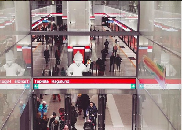 埃斯波地铁塔皮奥拉站站台,女孩EMMA指引工作走入EMMA。