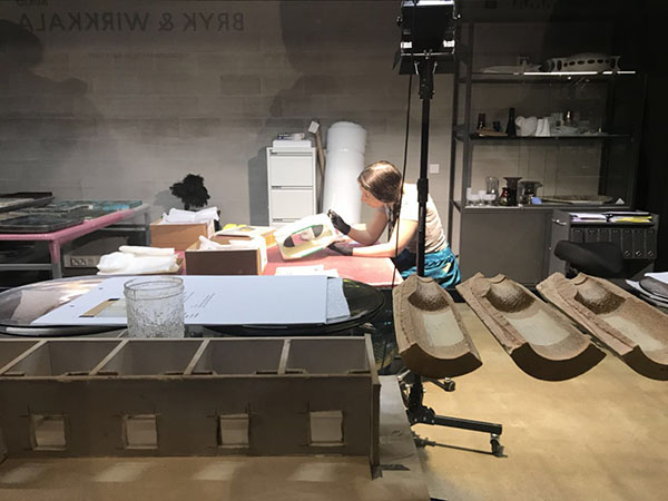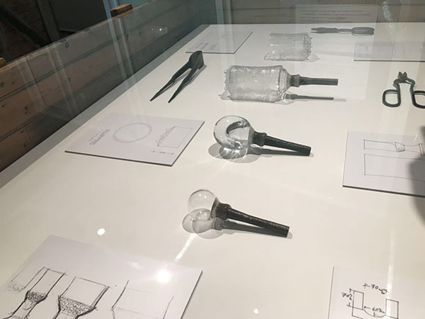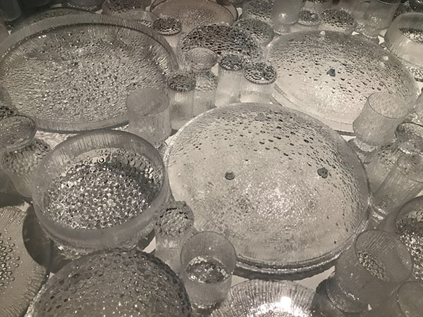 另一件特别的作品来自塔皮奥·维尔卡拉(Tapio Wirkkala ,1915-1985)的大型木雕作品,寓意着千湖之国连绵起伏的森林和湖泊。维尔卡拉被认为是芬兰在工业艺术领域开创新时代的领导人物。1946年他设计的艺术玻璃赢得了伊塔拉玻璃(Iittala Glassworks)设计大赛,并被聘用。也因此维尔卡拉为伊塔拉公司设计的玻璃器皿尤为著名,其中最有代表性的产品之一是极冻系列(Ultima Thule),目前依旧在生产、公众可以在百货公司方便地买到该系列使用。EMMA的“BRYK和维尔卡拉可见的收藏和展览”(BRYK & WIRKKALA VISIBLE STORAGE AND EXHIBITIONS)展出维尔卡拉“极冻系列”设计草图和玻璃吹制过程。维尔卡拉的很多设计成为了经典的物品,例如黄菇花瓶(Kanterelli-maljakko)、伏特加酒瓶等。除了从事玻璃设计外,维尔卡拉还运用木材、瓷器、金属、塑料等多种材质制作艺术品和实用品,他以传统芬兰小刀为原型,设计了自己型号的芬兰小刀也被公众喜爱。此外,维尔卡拉还是建筑师和平面设计师。这种跨学科、跨专业的艺术探索也几乎成为了芬兰艺术家的常态。