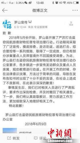 中新网信阳6月9日电(记者 刘鹏)6月9日,河南省罗山县“打击盗窃民航旅客财物犯罪专项治理行动办公室”就发布的一则含有“株连三代人”“飞天大盗之家”等言语的告知书公开致歉称,因相关工作人员法律意识淡薄,导致告知书出现了十分不妥的言语,对此深表歉意。