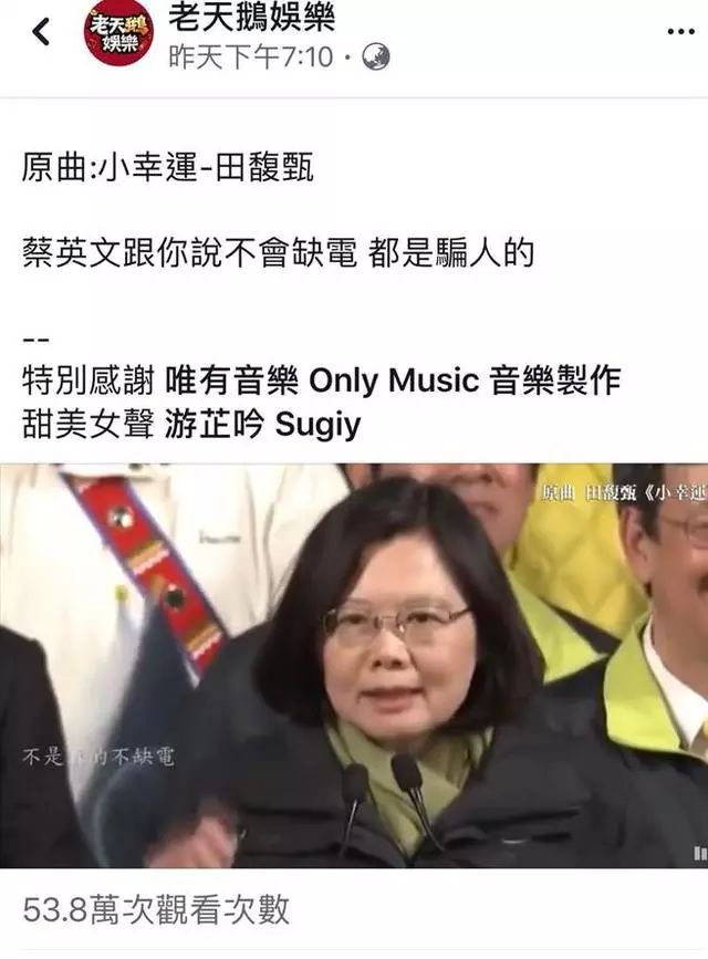 中国台湾网6月9日讯 据台湾“中时电子报”报道,台湾歌手田馥甄为电影《我的少女时代》演唱主题曲《小幸运》红遍街小巷,脸谱网粉丝页“老天鹅娱乐”将歌曲改编歌词成“缺电英”重新演唱,歌词句句切中时事酸爆台当局,例如“每到月底好伤心,我吃饭都有问题你却拿钱给海地”“投给你的时候,还动了感情,两年了,才发现说谎成性,为什么没有发现票给了你,那谦卑都成了梦境”,最后一句“你去吃姑婆芋”让网友笑说“我快笑死了,还姑婆芋,如果连香蕉是给猪吃的那段也放进去就更好了!”